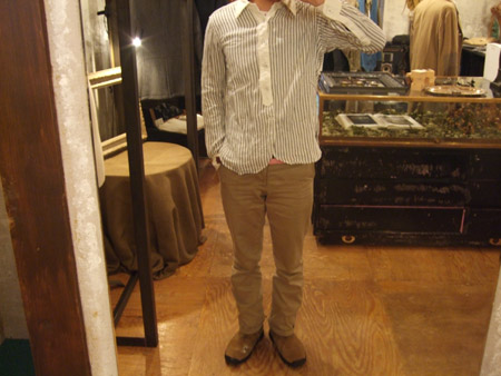 ストライプ地の織柄が面白いシャツ。