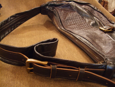 ベースはダークブラウンで、光沢のあるレザーを全体に使用しています。