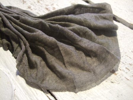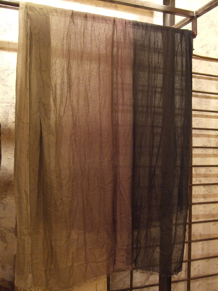 二枚重ねているわけではなく、一枚を2色に染め上げていて、ベージュから何段階かの色を経て、ブラックへとグラデーションがかかっています。(サイズ感、生地感も少しは伝わるでしょうか)