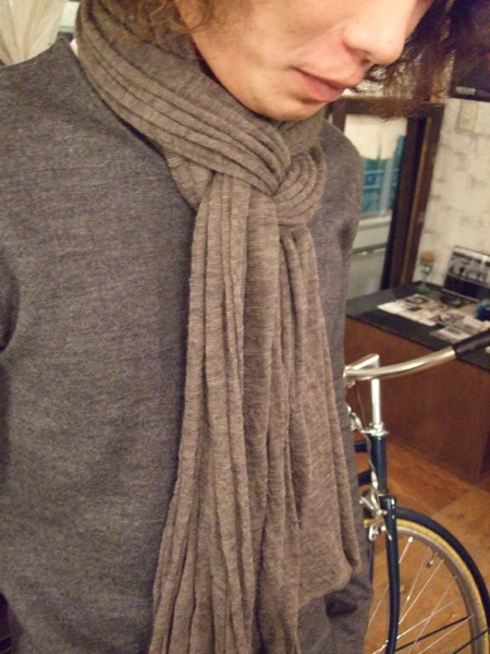 今回のようにニットに合わせるだけでも、着こなしの見栄えはかなり変わりますし、勿論、編みこんで使用すれば、ジャケットやアウターの首元にもバッチリはまります。